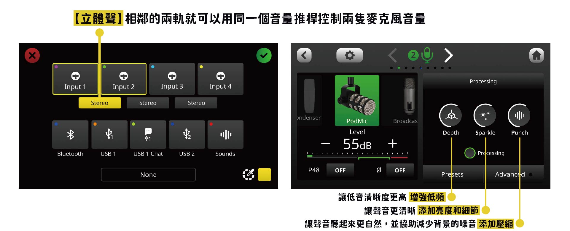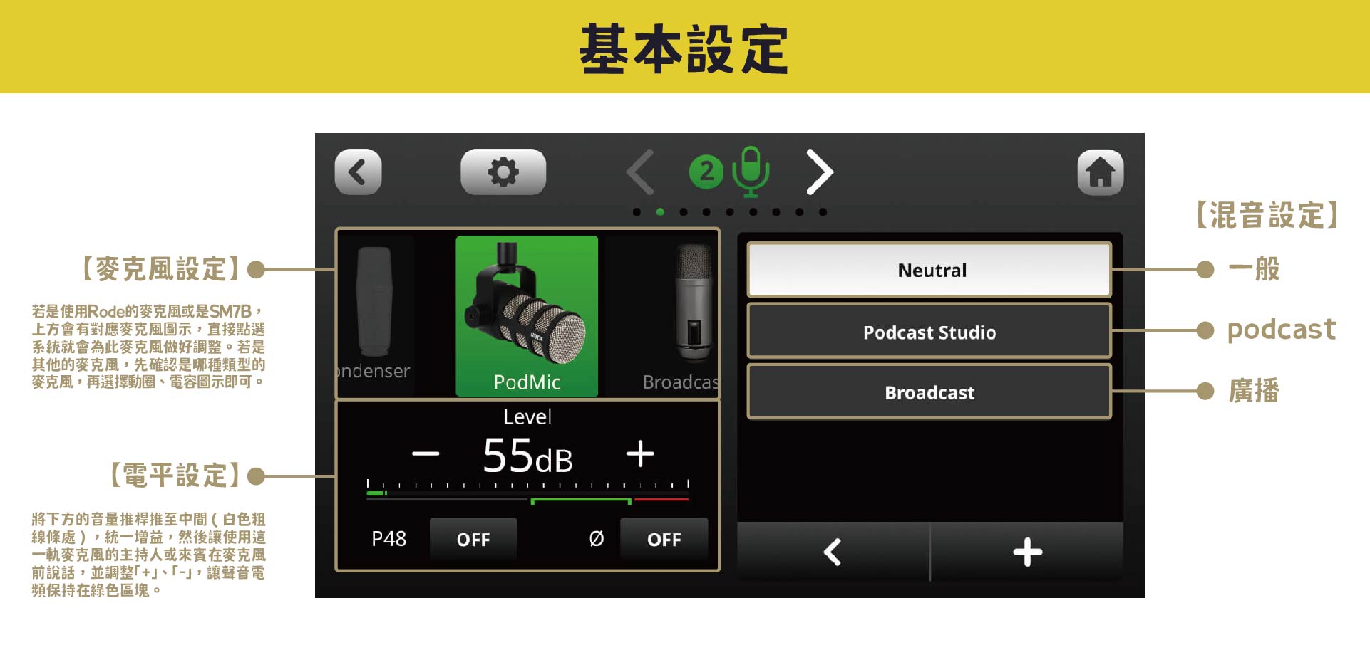 ※麥克風圖示:若是使用 Rode 的麥克風或是 SM7B,上方會有對應麥克風的圖示,點選就會直接為此麥克風做好調整。若是其他的麥克風,先確認是哪種類型的麥克風,再選擇動圈、電容圖示即可。