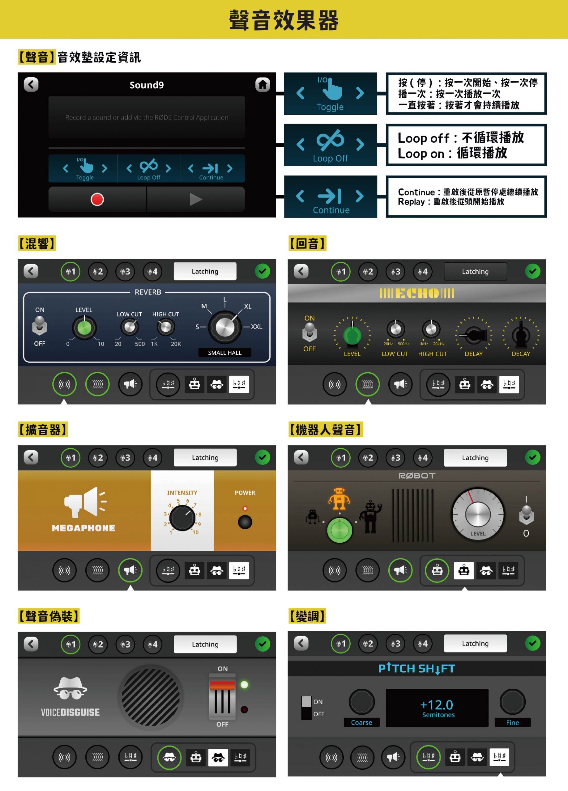 Latching 鎖定模式:按下音效墊功能開始,再按一次功能停止。