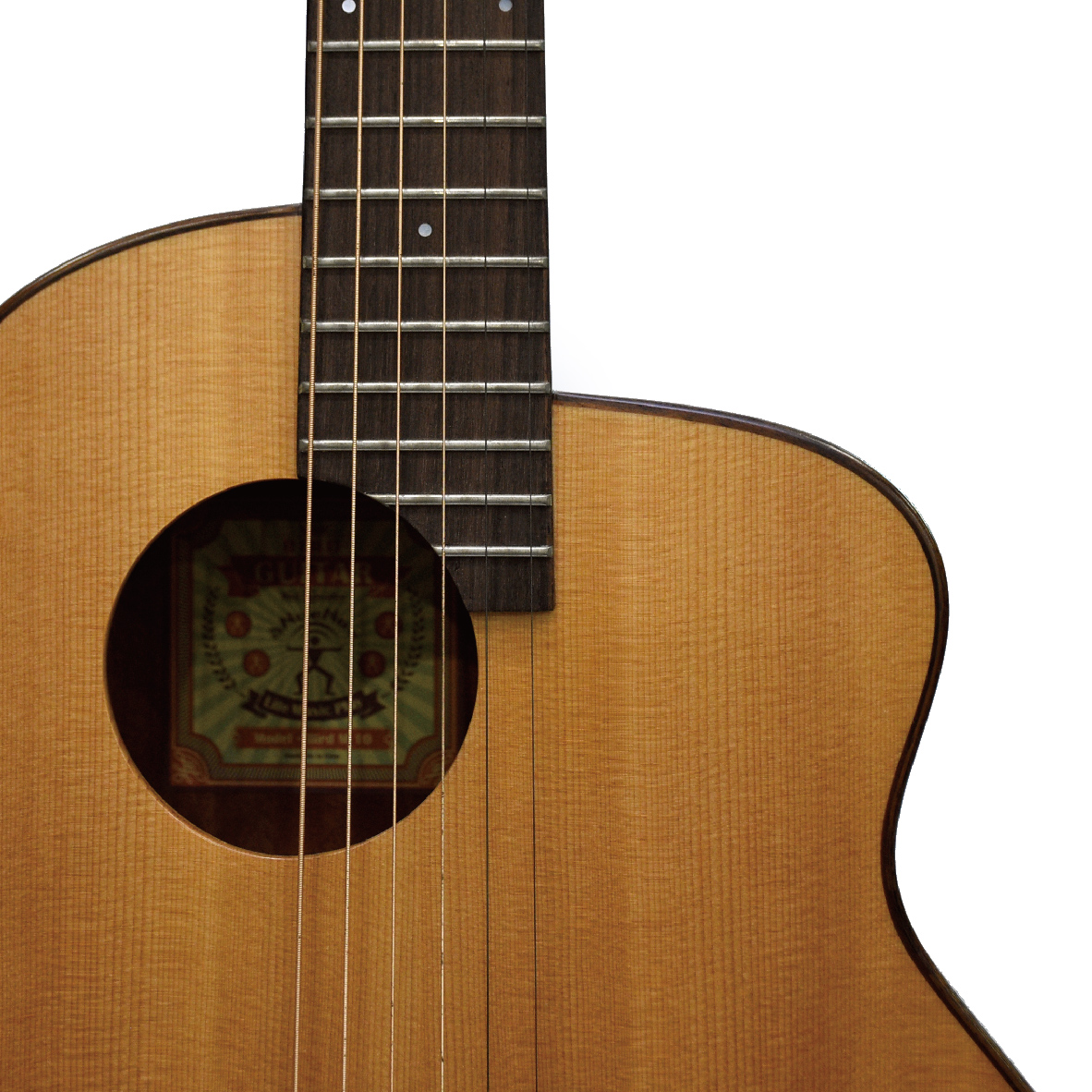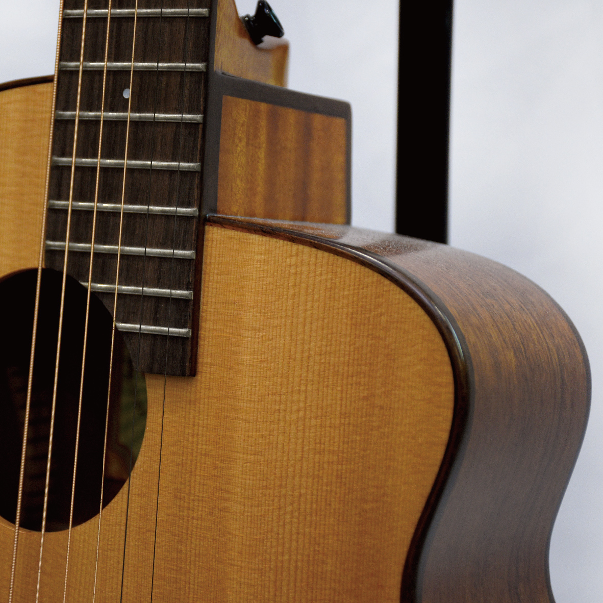 使用配置為單板西加雲杉木面板,搭配合板桃花心木背、側板,聲音傳導較快。琴身使用亮啞光漆,漆面似磨砂質感,展現視覺柔和感。