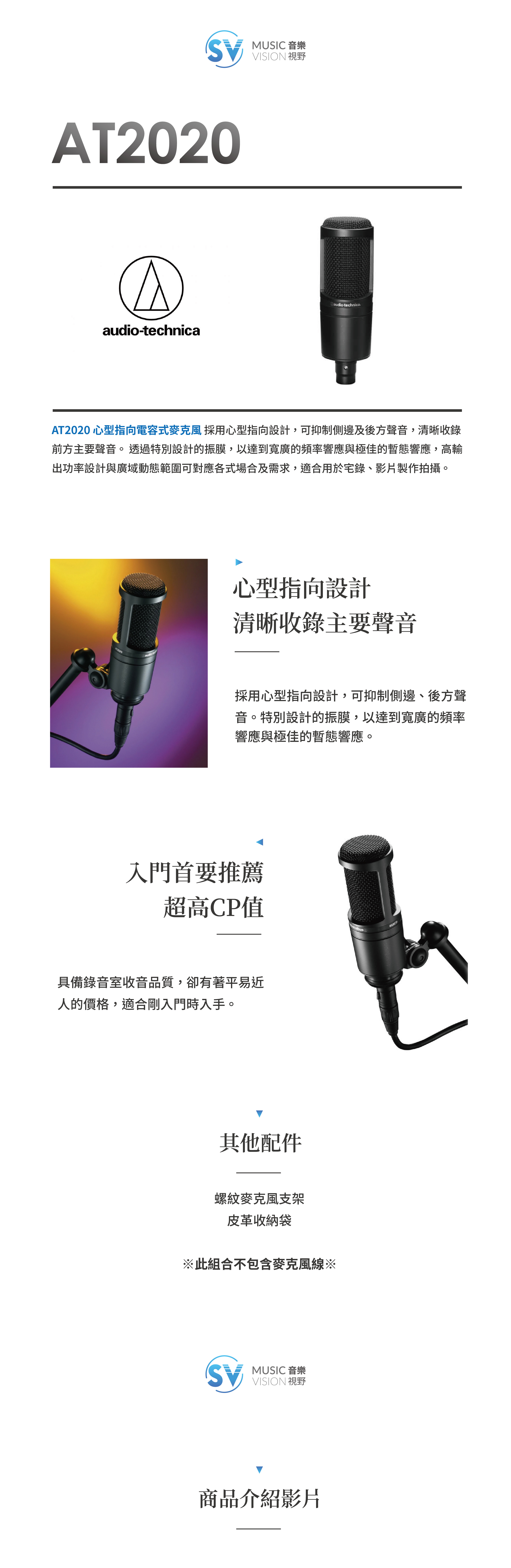 「早期富安老師Cover影片都是用這支麥克風的USB版(兩者性能上無差異,直接插電腦的話可以選擇USB版),我們自己也有去鐵三角上關於麥克風的訓練課程,AT2020跟其他同價位電容式麥克風比較,收音清晰就被凸顯出來!外觀上黑色烤漆上有霧面小點添增美感,看起來很專業!」