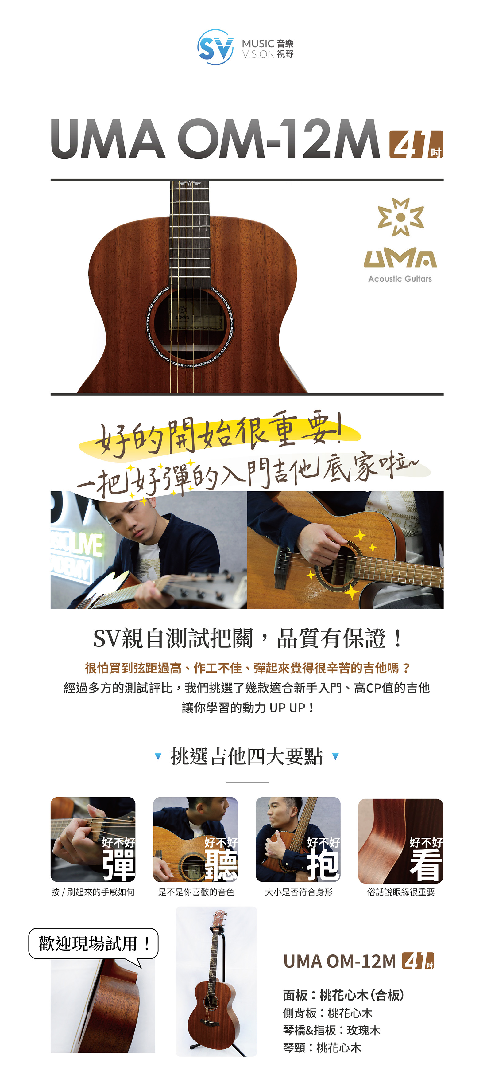 桶 身:OM桶身 面 板:桃花心木 側背板:桃花心木 琴 頸:桃花心木 指 板:玫瑰木 琴 橋:玫瑰木 旋 鈕:全封閉高級旋鈕